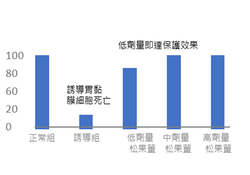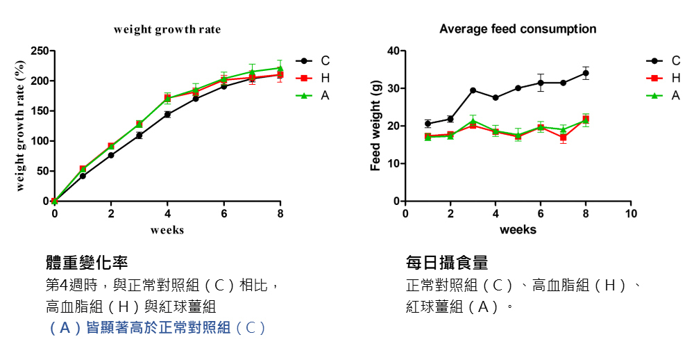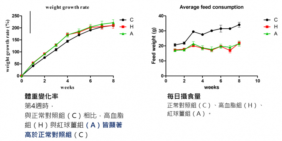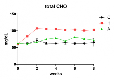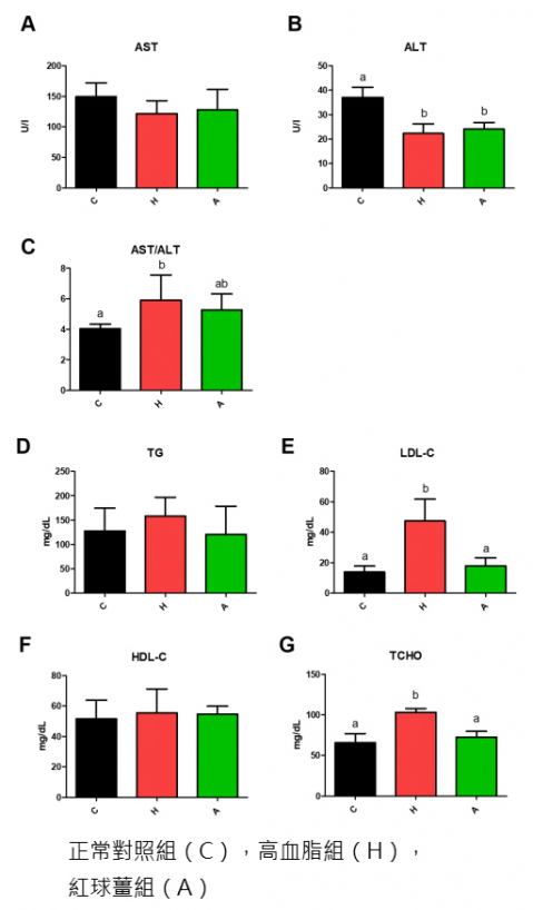 第1週至第8週高血脂組(H)的血清內總 膽固醇濃度(mg/dL)每週皆顯著高於正 常對照組(C)與紅球薑組(A)。紅球薑組 (A)在第1、2、5、8週時與正常對照組間 (C)無組間顯著差異,在第3、4、6、7週 時則顯著高於正常對照組(C),但顯著低 於高血脂組(H)。